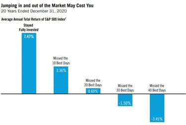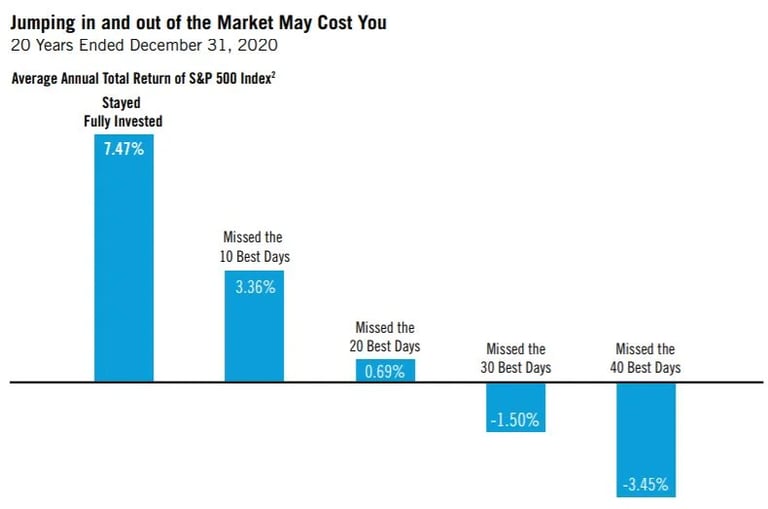 For example, if you were out of the market on the best days in the last 20 years, your gain would have been less than half of what it would have been if you were invested during the whole period: